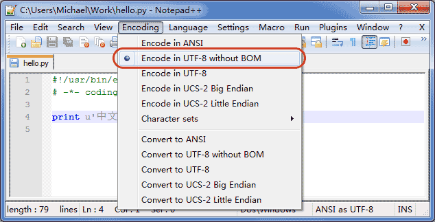 注意:如果你使用编辑器,同时需要设置 py 文件存储的格式为 UTF-8,否则会出现类似以下错误信息:
